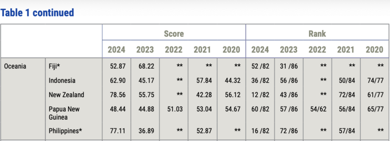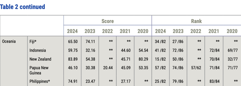 Fiji was the best-performing country in Oceania, ranking 31st, followed by New Zealand at 43rd. Papua New Guinea placed 57th while the Solomon Islands came in last at 84th, due to tied scores despite only 82 jurisdictions being listed.